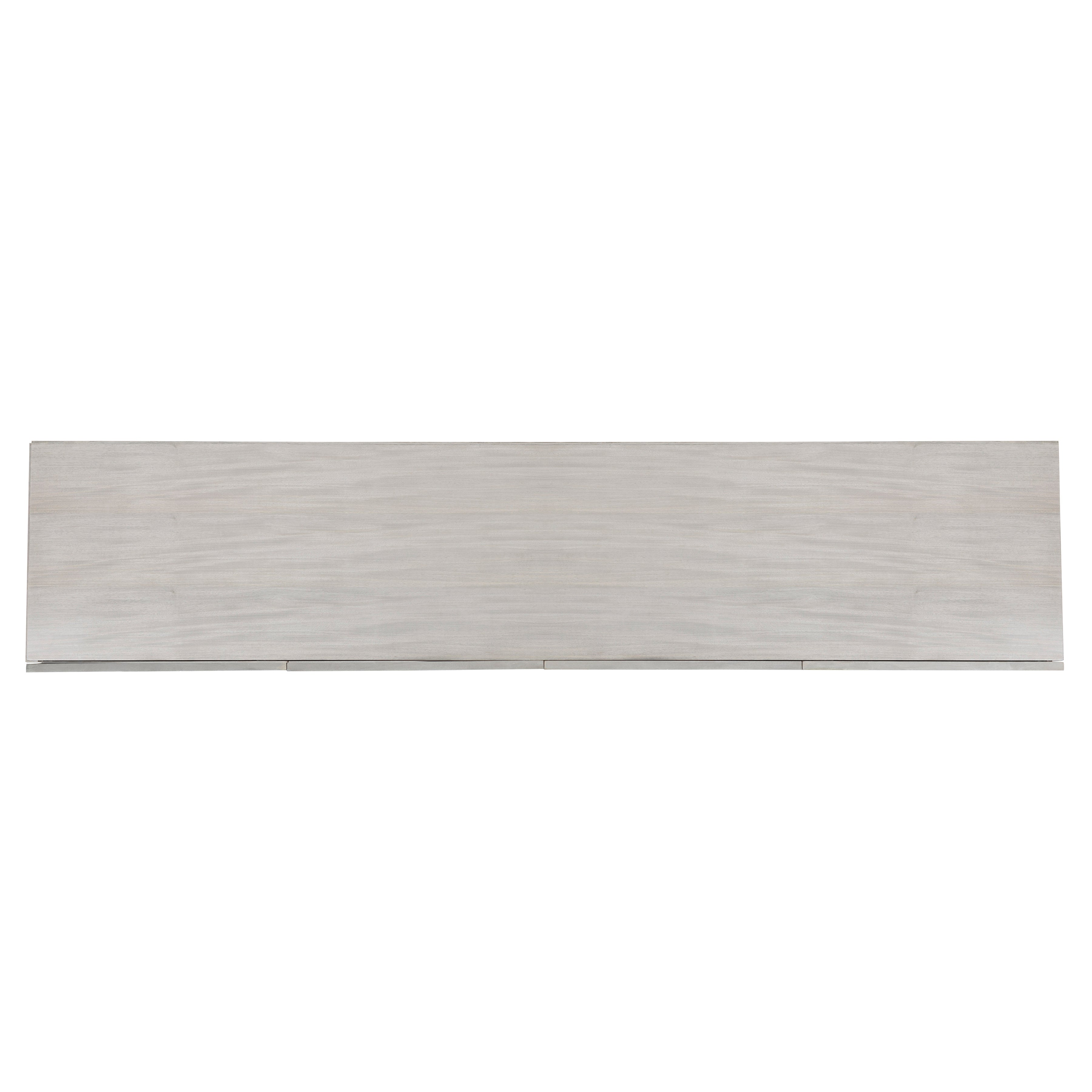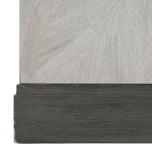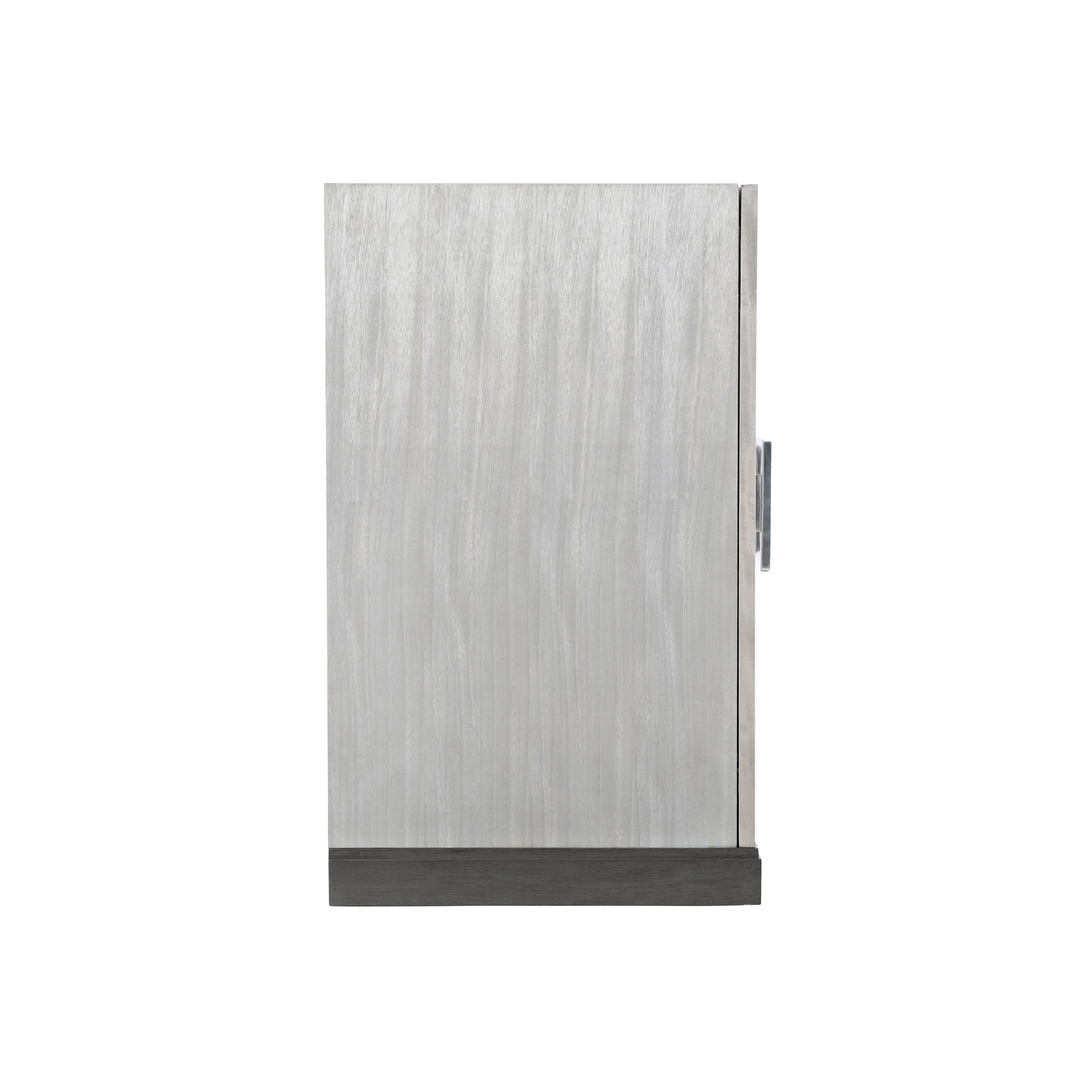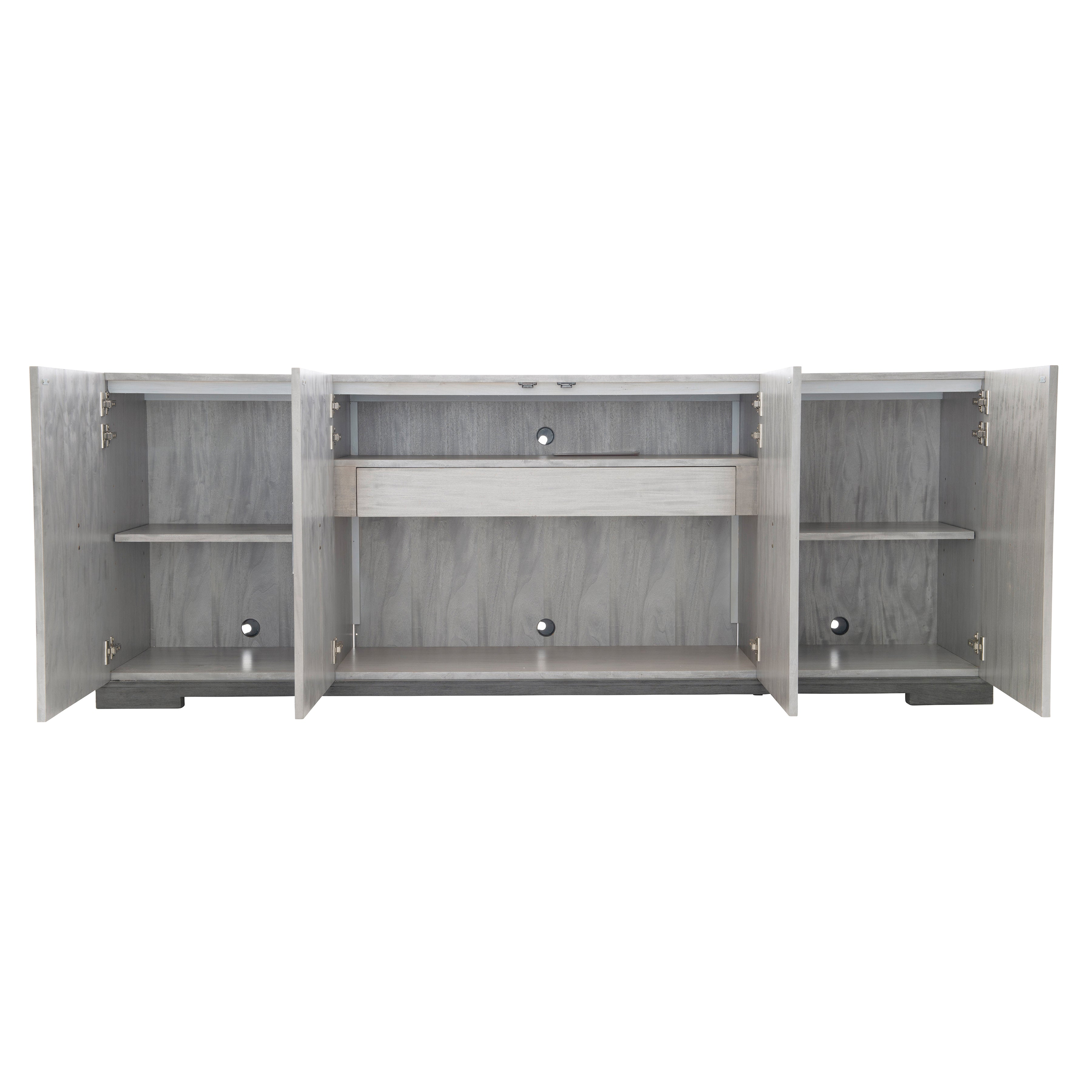 Prima Vera veneers in Light Gray finish with Base in Matte Black finish.Four fancy face doors.Behind end doors is one adjustable/removable shelf, ventilation holes and one grommet hole with cover and bottom shelf surface.Behind paired center doors is one fixed shelf, one drawer with finger pull, bottom shelf surface, ventilation holes and two grommet holes with cover in back panel.Adjustable glides & Anti-tip kit.