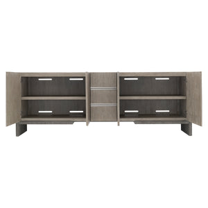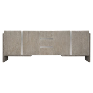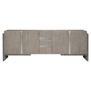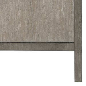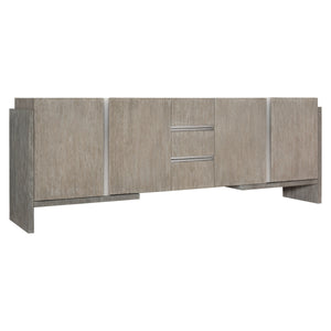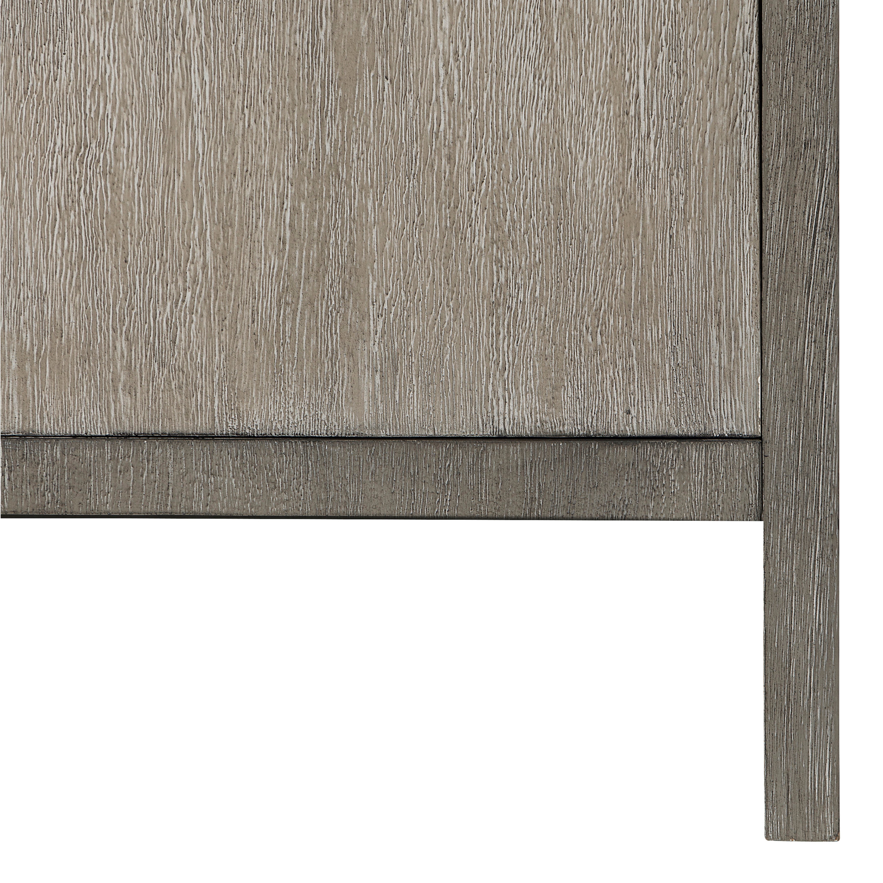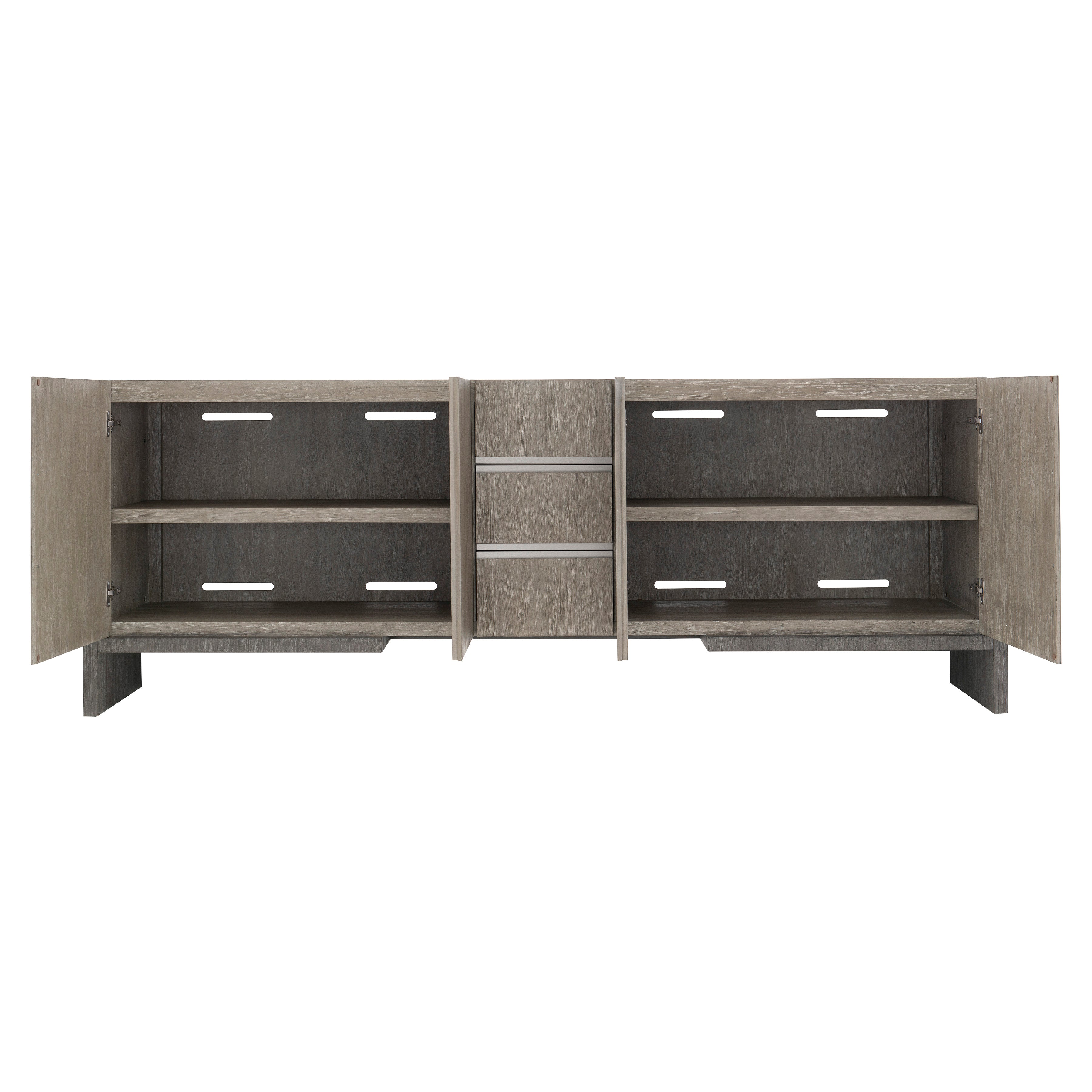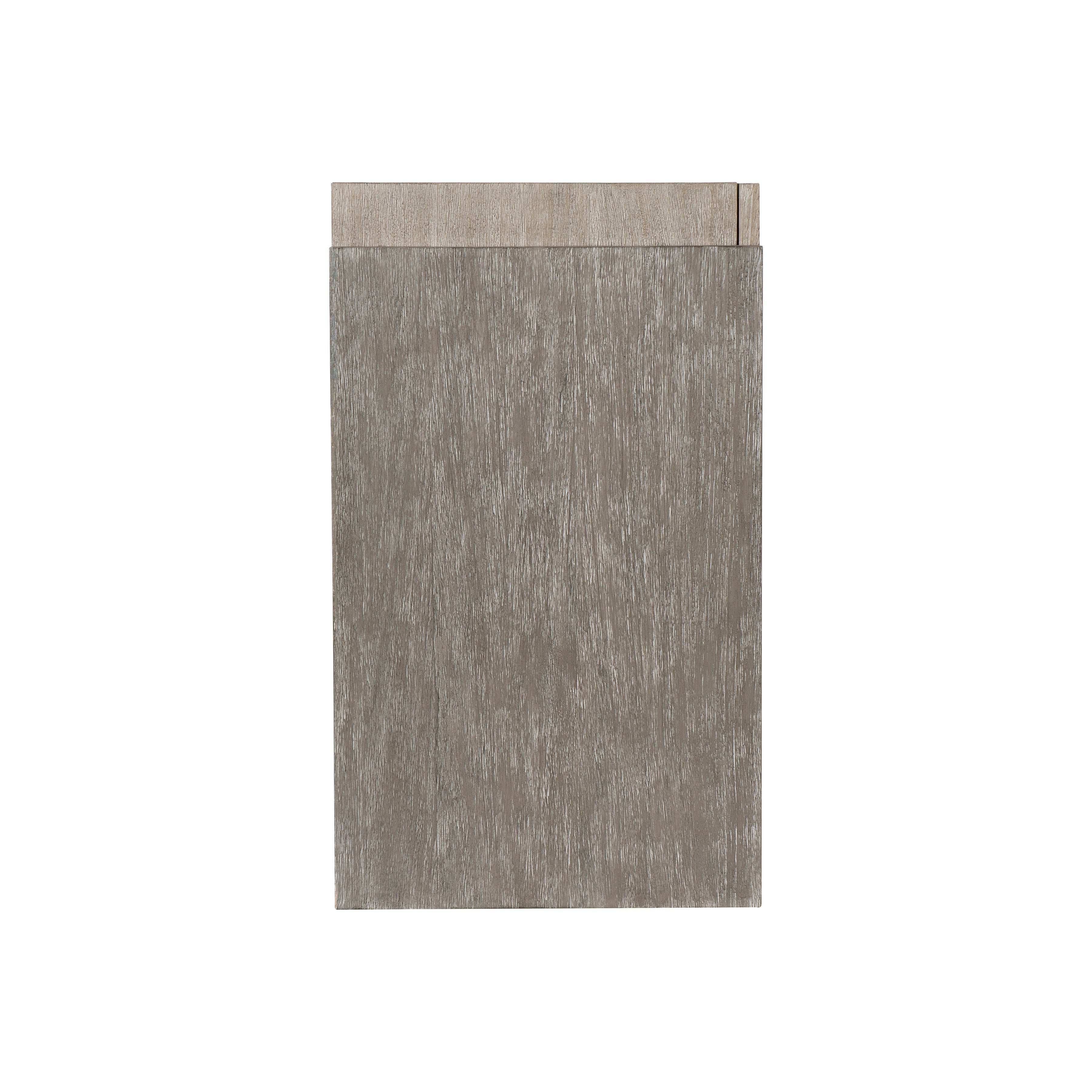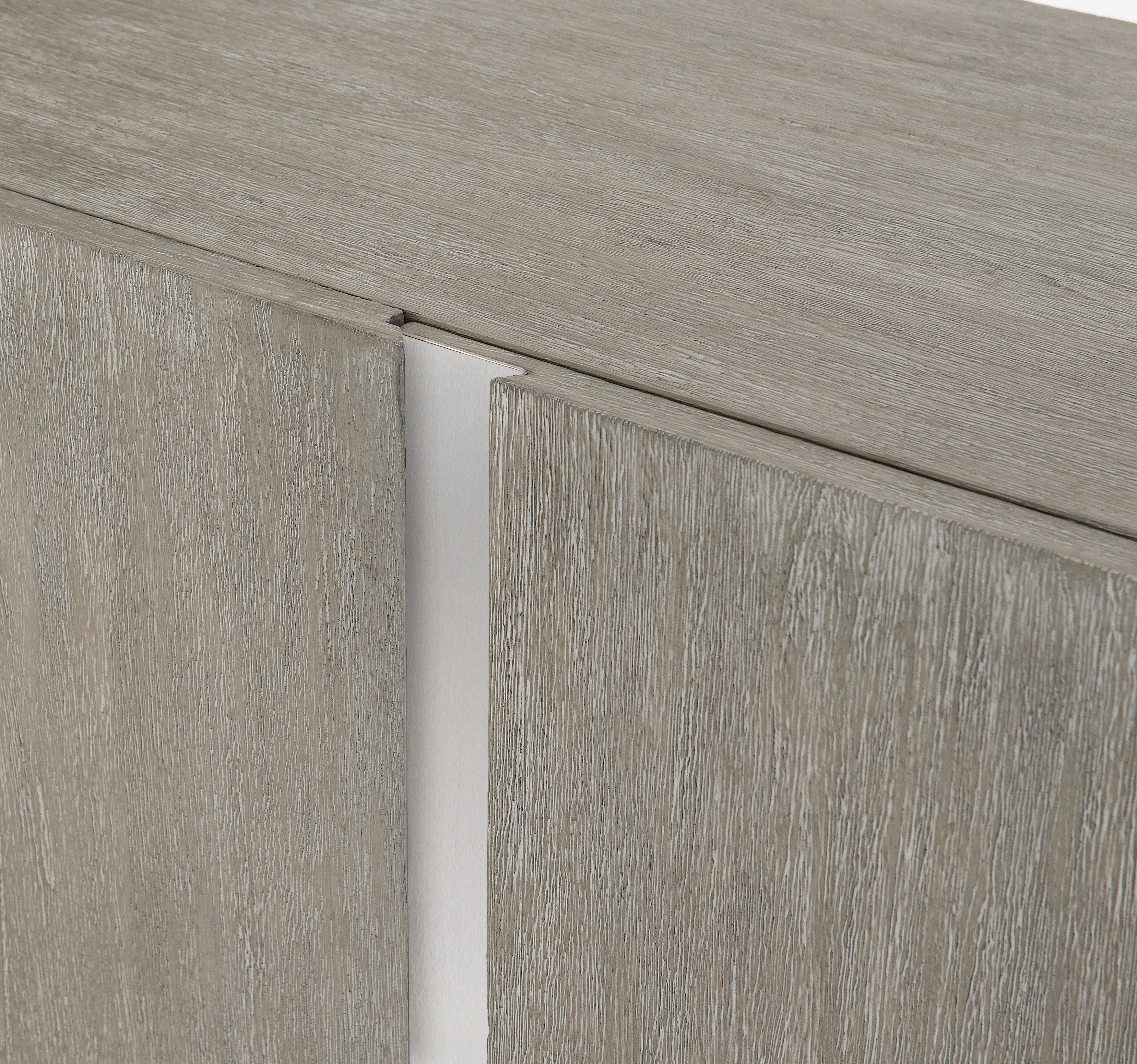 Two-tone finish - Case in Light Shale finish and support panels and rails in Dark Shale finishTwo soft/self-closing doorsBehind pair of doors is one adjustable/removable shelf and one fixed bottom shelf surfaceVentilation holes and one grommet hole with cover in back panelThree soft-closing drawers with finger pulls and inset brushed stainless steel plate