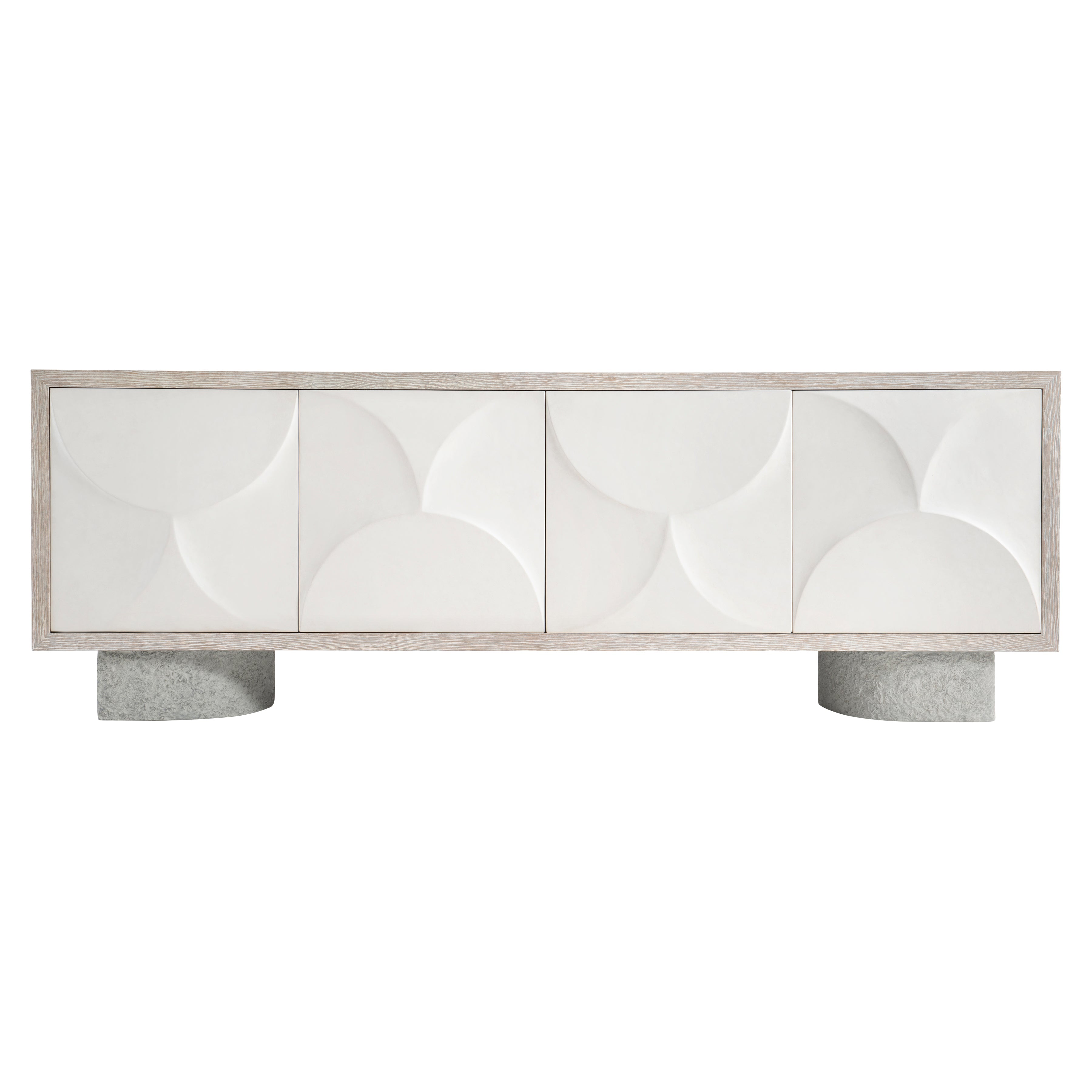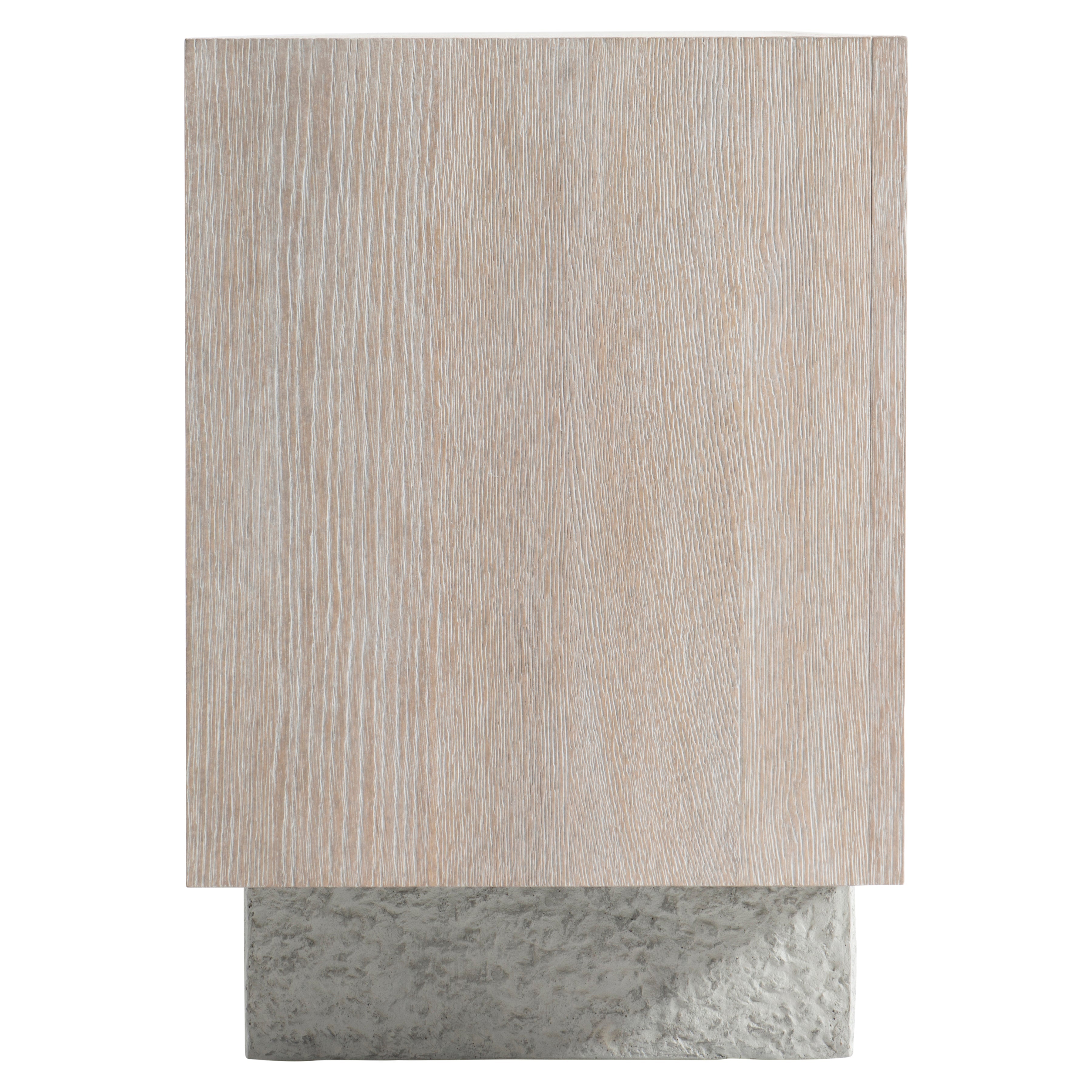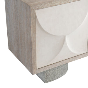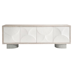 Flaxen finish. Sand Grey finish on two shaped cast concrete bases with rough texture.Four concealed hinge soft-closing doors with patterned cast resin door fronts in Vellum finish.Behind each door are two adjustable/removable shelves, vents, and a covered grommet.Adjustable glides.Anti-tip kit.