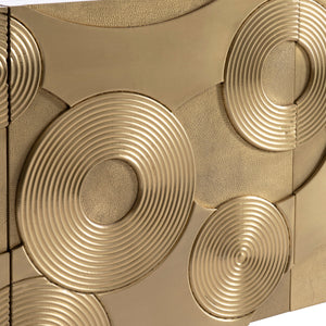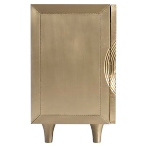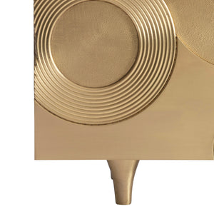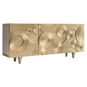 Wood credenza with brass-clad exterior and black interiorThree push-to-open doors with circular ripple pattern on door frontsBehind paired left and center doors are a compartment at top with vents and a covered grommet hole above a fixed shelf with a drawer underneathBelow the drawer are two compartments separated by a fixed partitionBehind the right door are two adjustable/removable shelves, vents and a covered grommet at the bottom