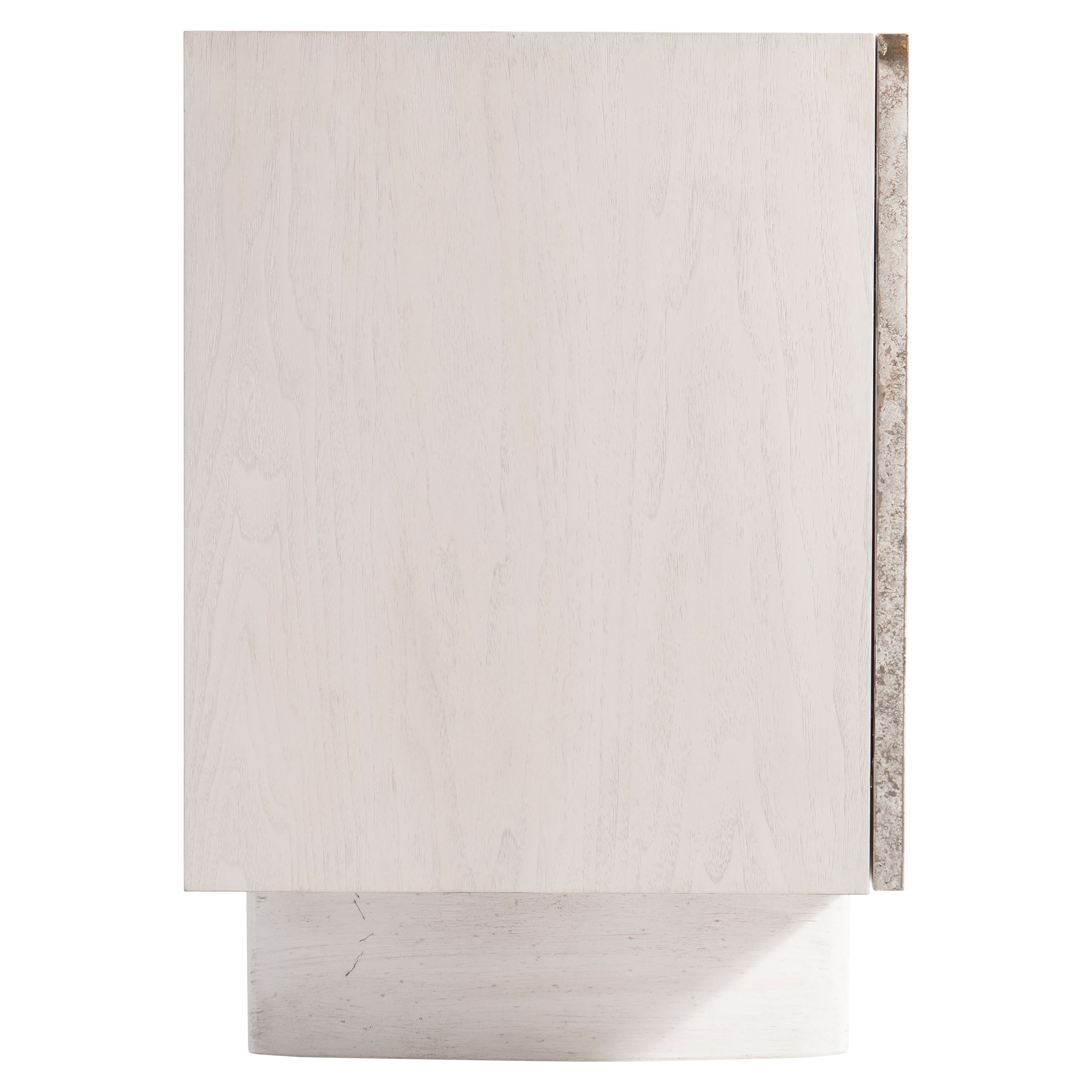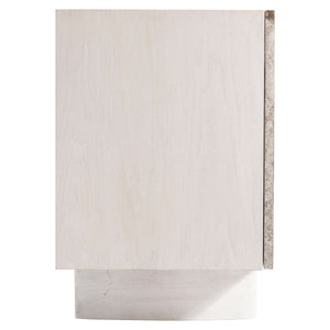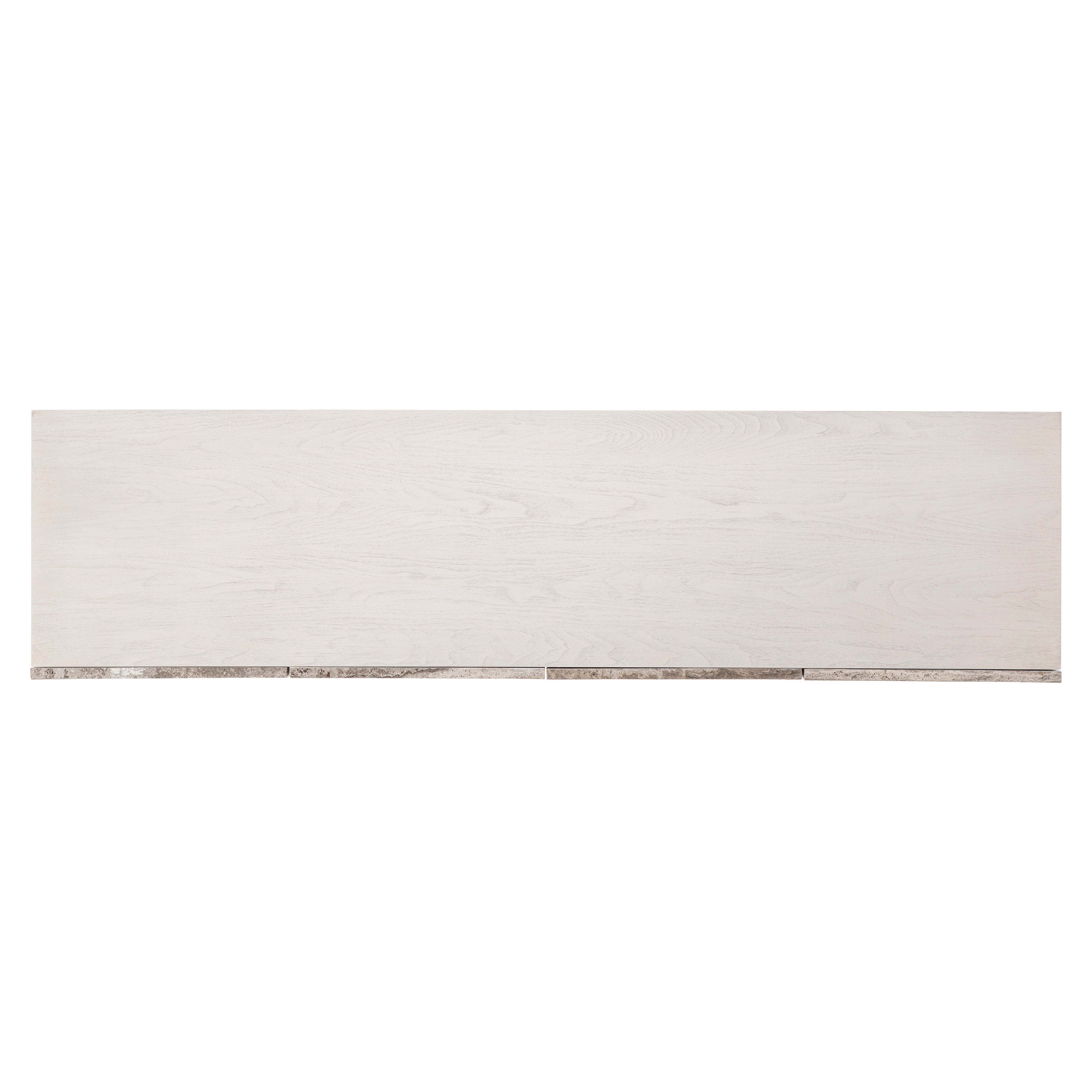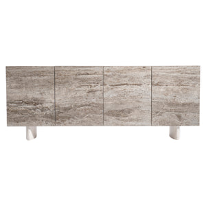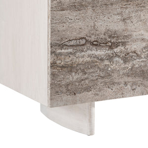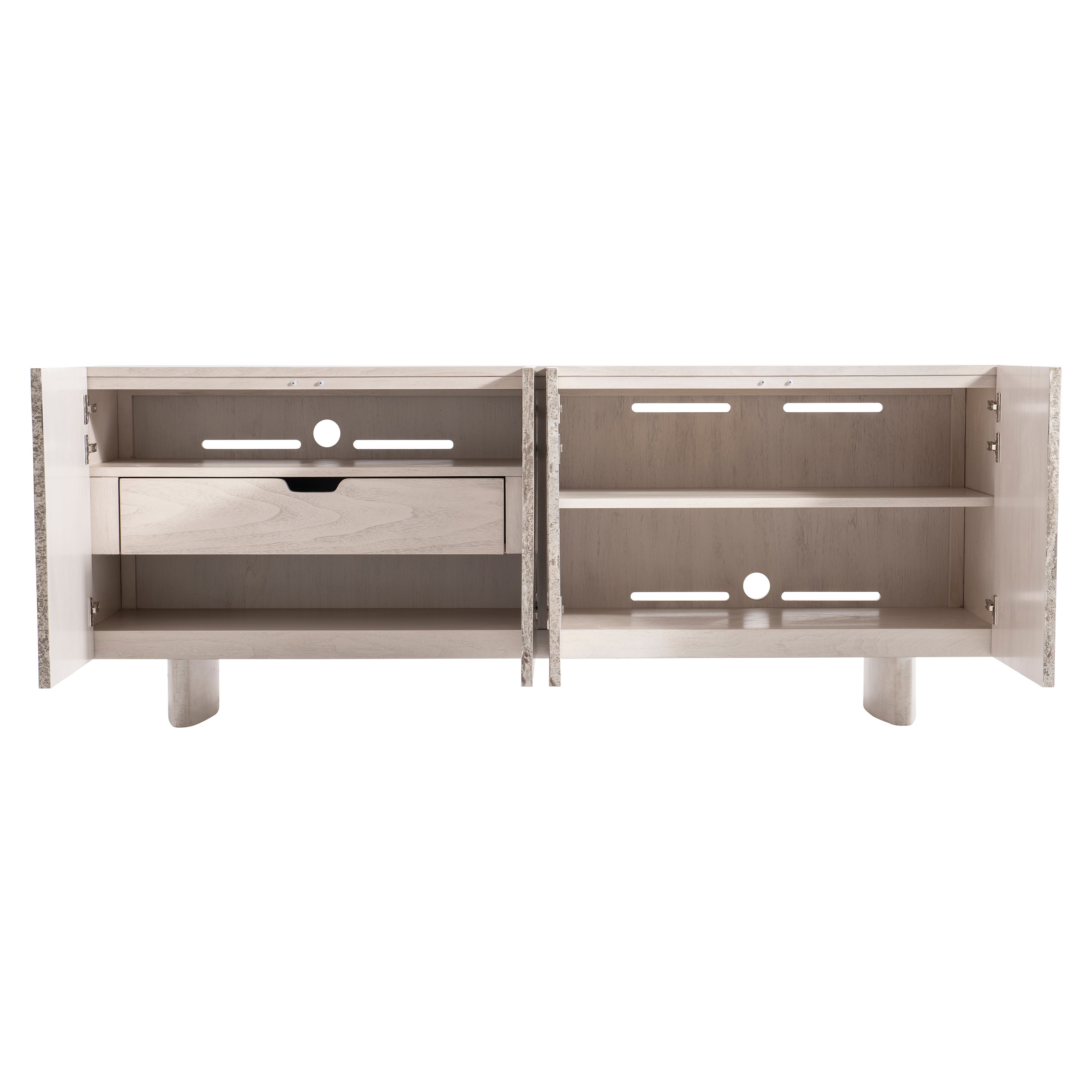 Walnut wood case in Lutra finish with silver travertine door fronts and Lutra Faux Stone finish on cast resin baseFour push-to-open, soft-close doorsBehind left two doors are two fixed shelves with one long drawer between them, vents and one covered grommet holeBottom shelf is divided by a partitionBehind right paired doors are one long adjustable shelf, vents and covered grommet hole