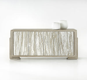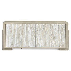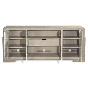Case of oak solids and veneers in Clay finish with faux stone doors in Kalta finishFour pull-to-open, soft-close doorsBehind left and right doors are adjustable shelves and grommet holesBehind center doors are a grommet hole and one pull-to-open, soft-close drawer with fixed shelves above and belowAdjustable glides