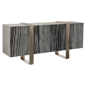 Cast aluminum frame in Textured Graphite finish wraps over top and down front of case, and forms the base. Wood top and end panels in Cerused Greige finish.Four pull-to-open doors, with concealed soft/self closing hinges, with laminated Black Forest stone fronts. Behind left and right door are two adjustable/removable shelves. Behind center paired doors are one fixed shelf with a drawer beneath it with hand pull cut-out.Wrapped pad in drawer.Black adjustable glides.Anti-tip kit.
