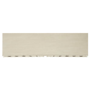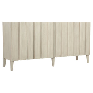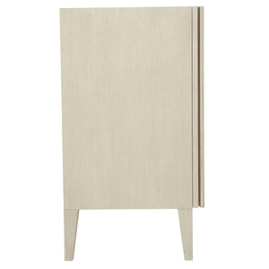 Foor doors with shaped vertical overlays.Behind left pair of doors are two adjustable / removable shelves, one bottom shelf surface, ventilation holes and one grommet hole with cover in back panel.Behind right pair of doors are two ajustable/removable shelves with removable wine bottle holders; each accomodating up to seven standard wine bottles, two stemware racks - each accomodating up to three stems and one drawer with finger pull and wrapped pad.Adjustable glides.Not designed to support TV and/or other media.