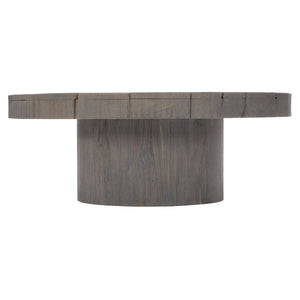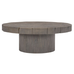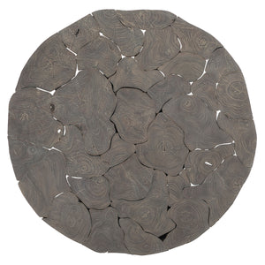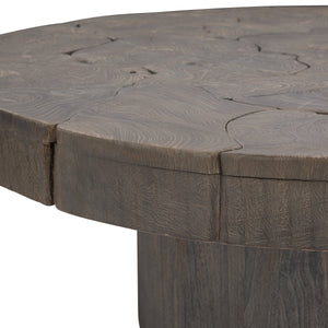 Round cocktail table in Smoked Truffle finish.Sliced solid teak wood top.Teak base.Adjustable glides.