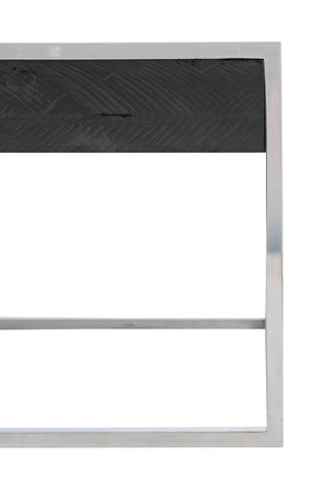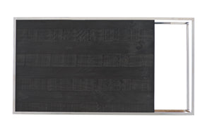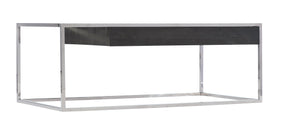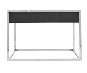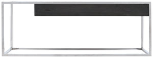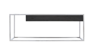Tubular stainless steel frame.Suspended wood drawer box Cinder finish.Drawer box positioned off-center.Adjustable glides.