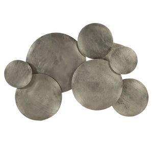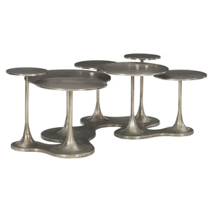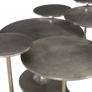Metal coctail table made up of seven small individual tables connected to a central base.Tops and pedestals of various sizes.Graphite finish.Adjustable glides.
