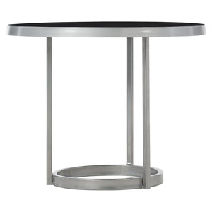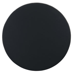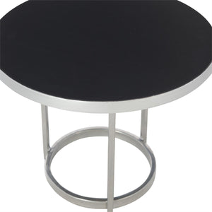 Round top of cast aluminum covered with Black baked enamel finish.Tubular iron base in Nickel finish.Three legs and stretchers.Adjustable glides.