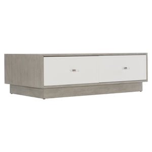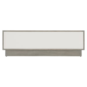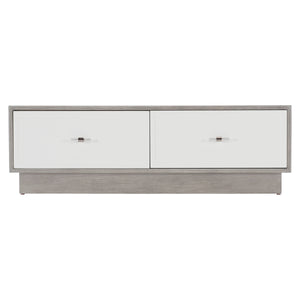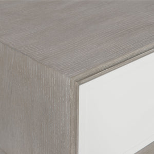 Table case in Cerused Greige finish.Two soft-close drawers with drawer fronts in Lacquered White finish.Hardware of lucite and Polished stainless steel.Casters.