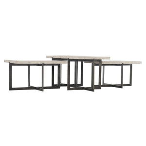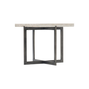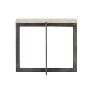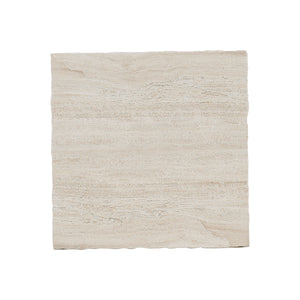 Square cocktail table.Laminated White Travertine stone top.Tubular steel base in oil-rubbed Bronze finish.Adjustable glides.