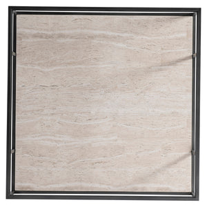 Inset tempered, beveled-edge glass top with tubular steel frame and stretchers in Oil-Rubbed Bronze finishLaminated white travertine stone shelfAdjustable glidesSpecifications subject to change without notice