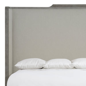 White oak solids and knotty white oak veneersWood-framed upholstered shelter headboard with wood baseUpholstered footboard and side rails with wood baseAll exposed wood in Pewter finishStandard with five wood slats with adjustable center support