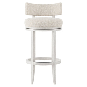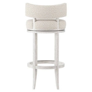 Wire-brushed wood frame and round stretcher ring.Low upholstered back, and upholstered swivel seat with return. Welt trim around seat.Powder-coated Black finish on Steel kick plate on front stretcher.