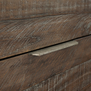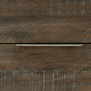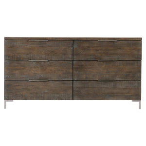 Sable Brown finish.Six drawers with metal tab pulls.Tubular steel feet in painted Gray Mist finish. Center wood support leg.Adjustable glides.Anti-tip kit.