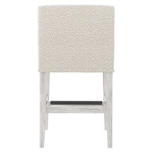 Horizontal channel upholstered inside back, upholstered outside back, and upholstered seat. Welt trim around seat.Wire-brushed wood frame and stretchers.Powder-coated black finish on metal cap rail on front stretcher.Glides.