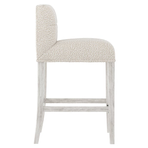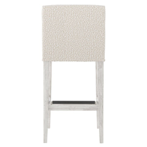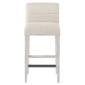 Horizontal channel upholstered inside back, upholstered outside back, and upholstered seat. Welt trim around seat.Wire-brushed wood frame and stretchers.Powder-coated black finish on metal cap rail on front stretcher.Glides.