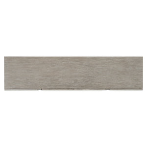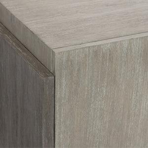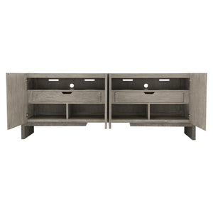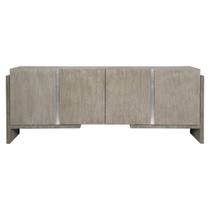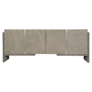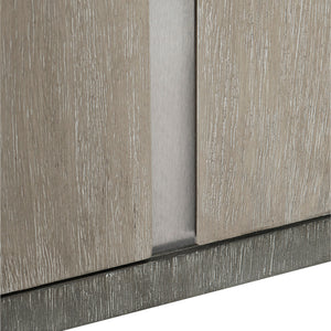 Two tone finish - Case in Light Shale finish, and support panels and rails in Dark Shale finishTwo pair of doors with finger pullBrushed stainless steel inlay between each pair of doorsBehind each pair of doors is an open compartment with ventilation holes and one grommet hole with coverBelow compartment is one soft-closing drawer with hand cut-out and two lower compartments with bottom shelf surface