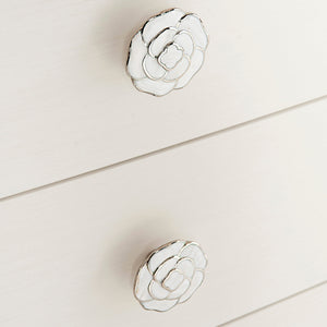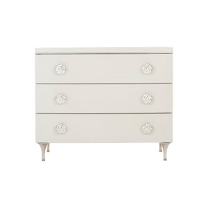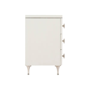 Eggshell finishInlaid polished stainless steel reveal under topThree soft-closing drawers with Hardware pulls in plated nickel with inlay of Kabebe shellPolished stainless steel feetAdjustable glides & Anti-tip kit