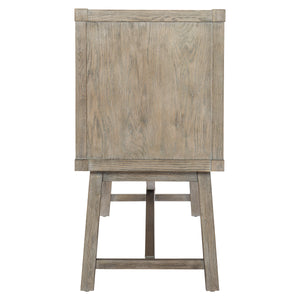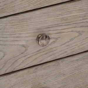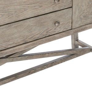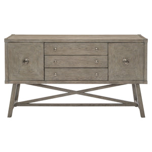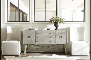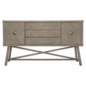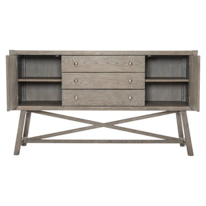 White oak solids and knotty white oak veneersSideboard in Pewter finishTwo doors with fancy face door fronts and one adjustable/removable shelf behind each doorThree center drawers with a brown guardian cloth silverware insert in the top drawerAdjustable glidesAnti-tip kitSpecifications subject to change without notice