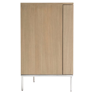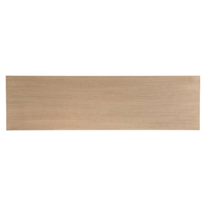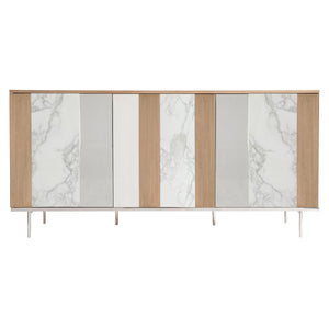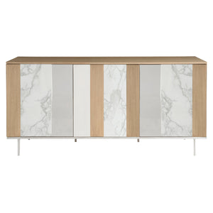 Sahara finish on veneered buffet with three push-to-open doors with concealed hinges. Door fronts and end panels consist of vertical panels of multiple materials. The first door has panels of wood, faux marble, and polished stainless steel. The second door has Adobe faux stone finish, wood, and faux marble. The third door has wood, polished stainless steel and faux stone. Left and right end panels have two wood panels.Behind each left end and right end door is one adjustable/removable shelf, with two vents and a covered grommet hole in the back panel. Behind the center door is a fixed shelf with one soft-close drawer beneath with hand-pull cutout. Guardian cloth silverware insert in drawer. There is one compartment above and below the drawer, with a vent and a covered grommet hole in the top compartment back panel.Polished Stainless Steel base.Two removable center support metal legs. Adjustable glides.Anti-tip kit and instruction sheet.