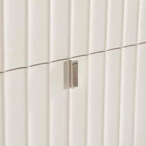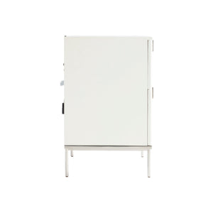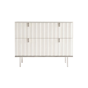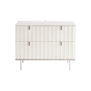 Adobe faux stone finish on rectangular wood nightstand. Polished Stainless Steel base.Two soft-close drawers with fluted design cast resin drawer fronts and metal pulls.Two-port USB charger on back of nightstand.Adjustable glides.Anti-tip kit and instruction sheet.