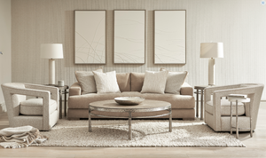 Faux stone top in Tusk finishTextured metal base and stretchers in Frosted Nickel finishLegs taper out slightlyAdjustable glides