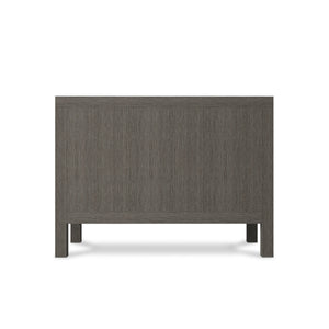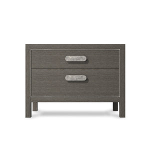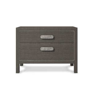 Ash solids and quartered oak veneer in Porcini finishTwo soft-close drawersDrawer pulls and Inset metal frame around drawer bank in Bright Graphite finishTwo-port USB charging system on back of caseFour legs with adjustable glides; Anti-tip kit