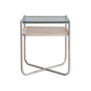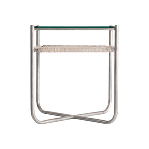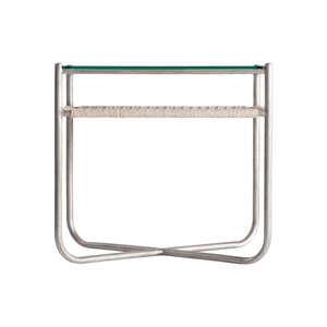 Steel frame in Graphite finish with woven abaca shelf in Light Grey Wash finish and a tempered glass top"X"-shaped bottom stretchersAdjustable glidesSpecifications subject to change without notice