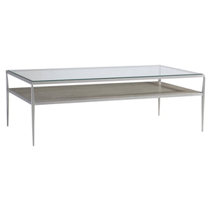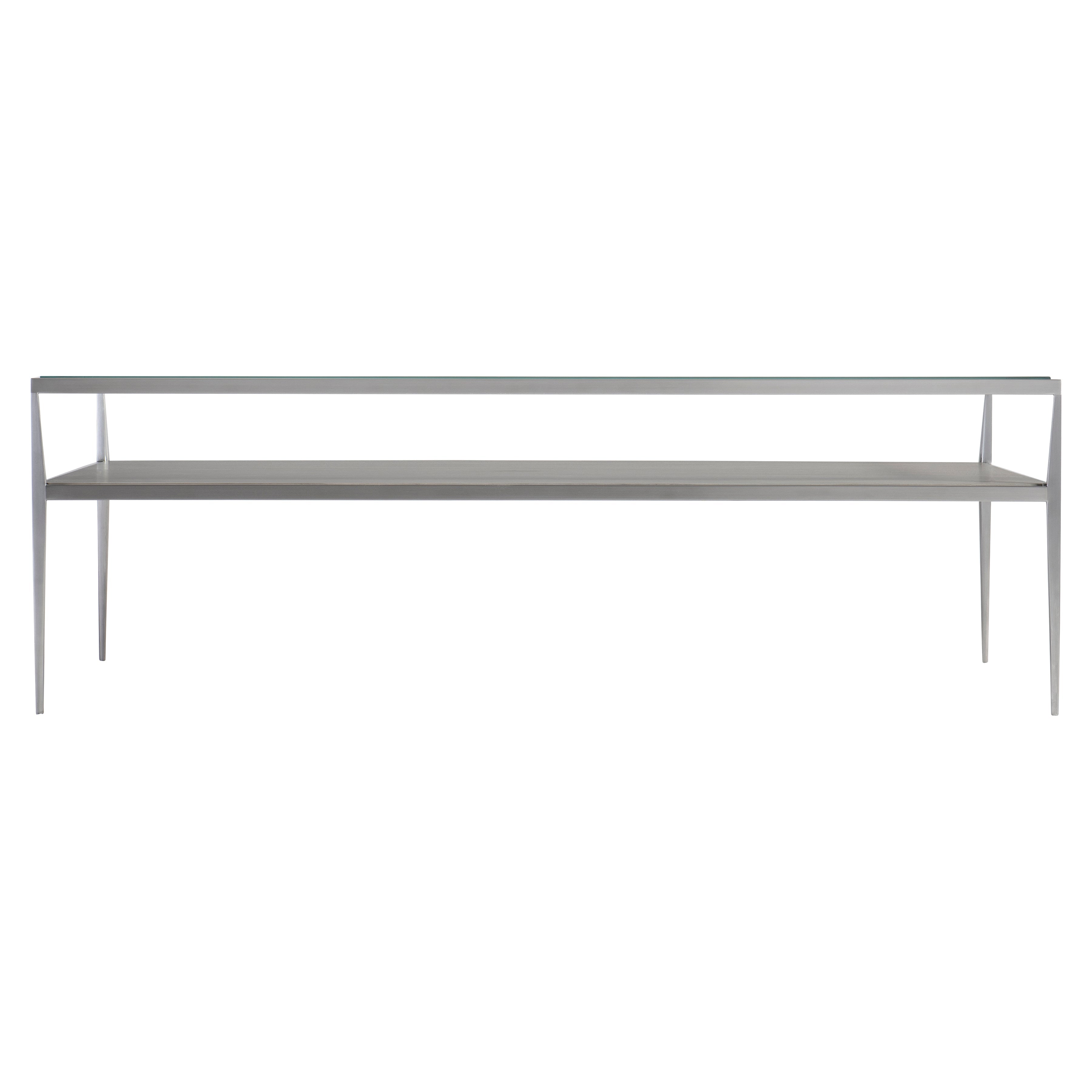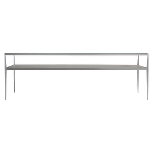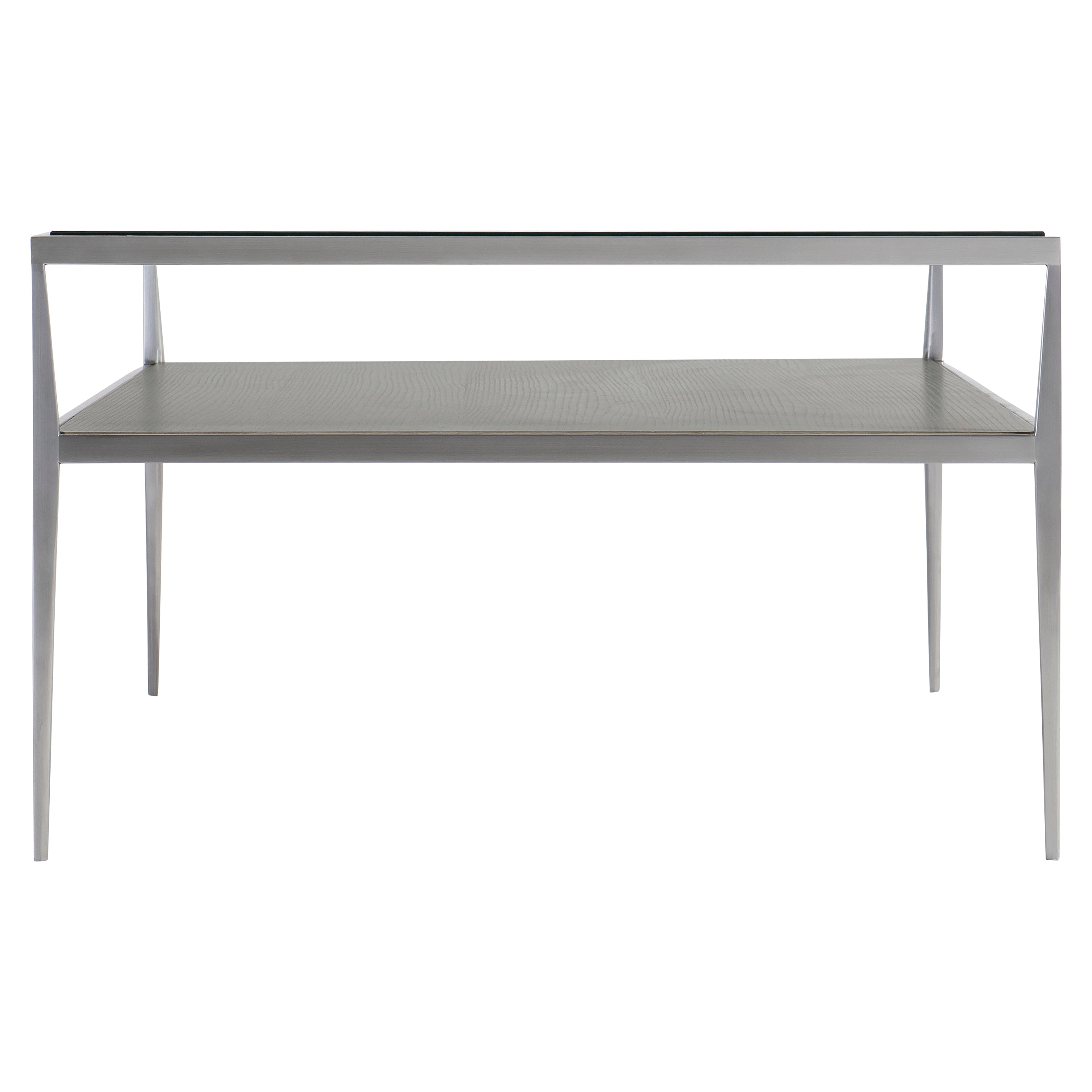 Metal frame in Brushed Stainless Steel finish with tempered, polished-edge glass top and one wood shelf in Nebbia finishAdjustable glidesSpecifications subject to change without notice