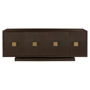 Flat cut walnut veneers in Ebonized finish.Four doors with beaded face.Behind end doors is one adjustable/removable shelf. Behind center doors is one drawer with silverware insert and one hold with grommet in back panel.Adjustable glides.Anti-tip kit.