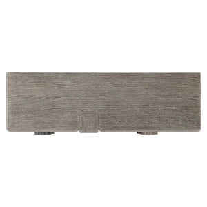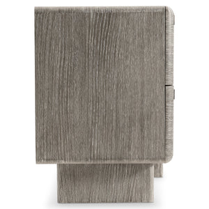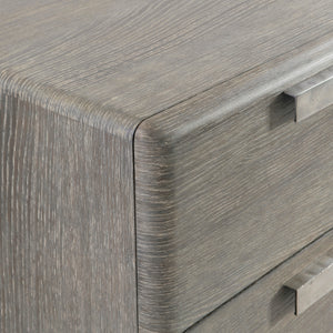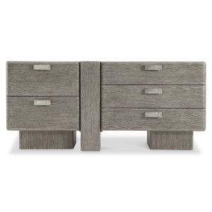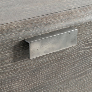 Wirebrushed oak in Puma finish with front postFive pull-to-open, soft-close drawers with cast aluminum tab pulls in Graphite finishAdjustable glidesAnti-tip kitNot suitable for use with TVSpecifications subject to change without notice