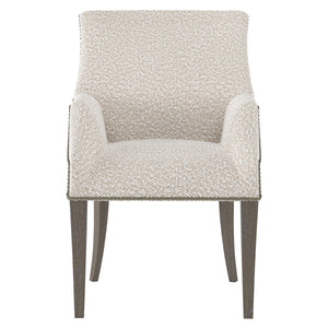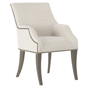 Fully upholstered chair with nailhead trim around outarms, outback and bottom of frame.Exposed wood legs.Recessed arms.