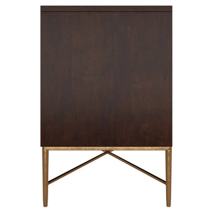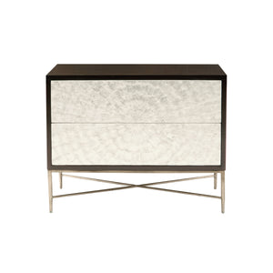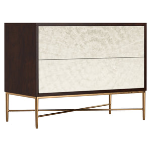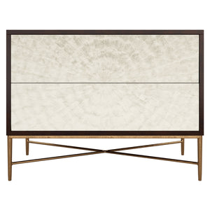 Gemelina solids and flat cut cherry veneers.Two touch-to-open drawers with Capiz shell drawer fronts.Hand-hammered, solid steel base in Bronze finish with 'X' style stretcher.Adjustable glides.Anti-tip kit.