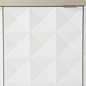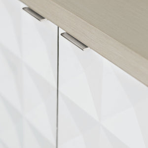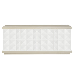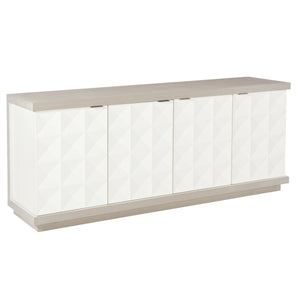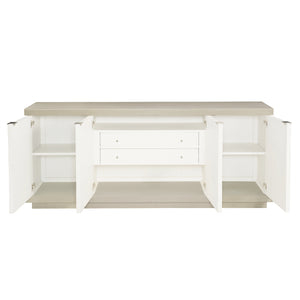 Poplar solids and engineered faux anigre�veneers.Linear Gray finish on case with Linear White finish on end panels.Four doors with cast shaped overlays in White Linen finish with soft/self-closing hinges. Behind end doors is one adjustable/removable shelf. Behind paired center doors are two drawers and two open compartments. Top drawer has silverware insert. Second drawer has wrapped pad.Adjustable glides.Anti-tip kit