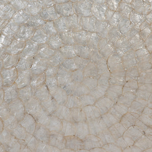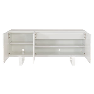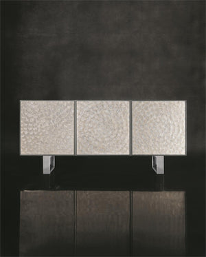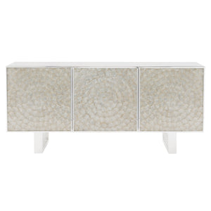 White finish. Two polished stainless steel open style legs. White painted interior.Three soft-closing doors with polished stainless steel frame with Capiz Shell panel in starburst pattern. Behind paired center and right doors is one adjustable/removable shelf, one drawer and one grommet hole with cover in back panel for wire management.Adjustable glides.Anti-tip kit.Note: Felt tabs on doors.