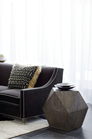 Triangular planes (chamfered corners) on upper portion of table.Squared tapered base.Wire-brushed oak veneers.Cerused Charcoal finish.