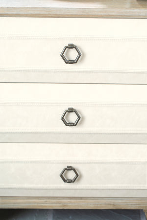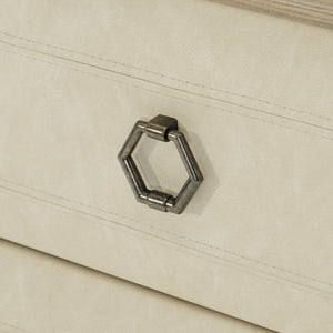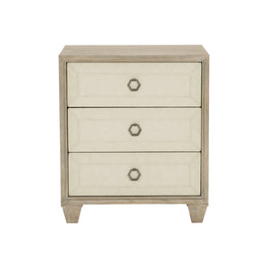 Three drawers with raised drawer fronts wrapped in performance fabric with double-needle stitching.Tapered foot.Adjustable glides.Anti-tip kit.