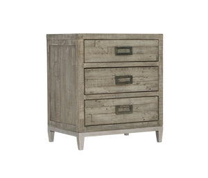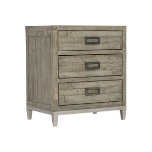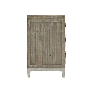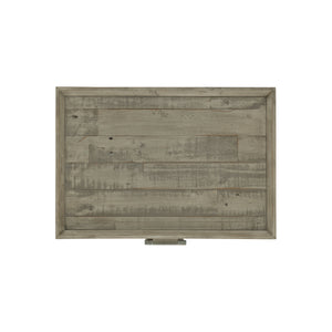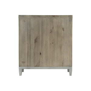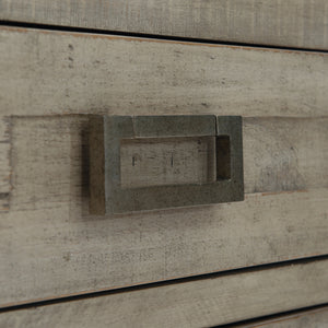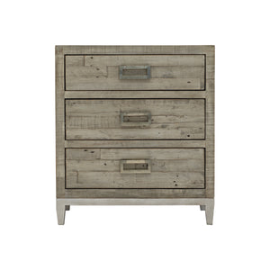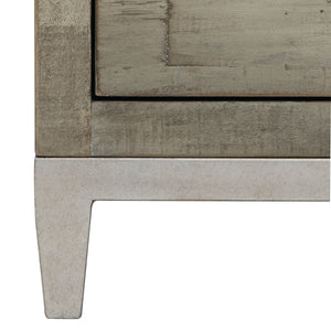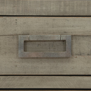 Planked design top, end panels and back in Morel finish.Three drawers with planked pattern.Tubular Steel base in Glazed Silver finish.Adjustable glides.Anti-tip kit.