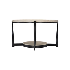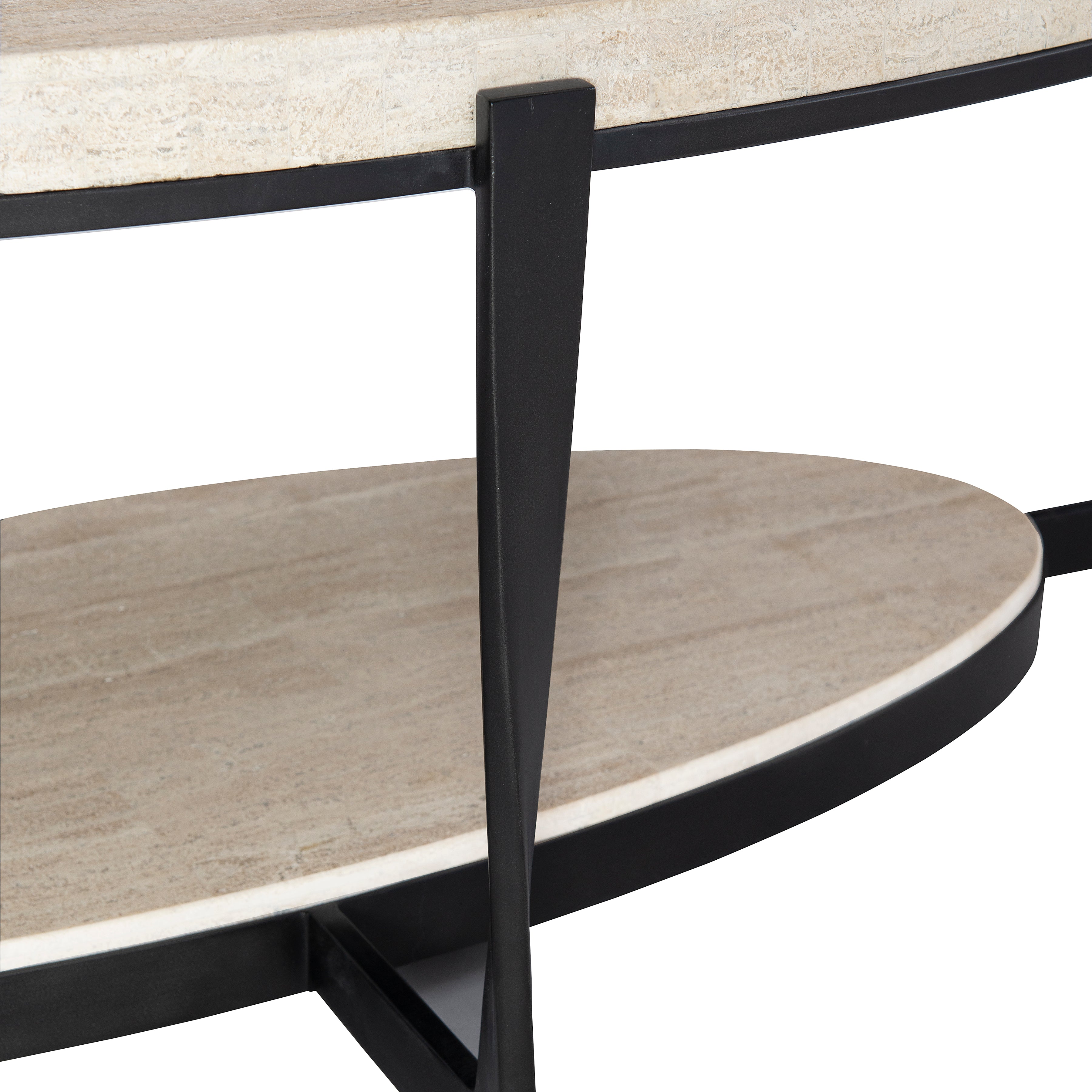 Oval cocktail table.Laminated White Travertine stone top and inset shelf with marine plywood core.Steel frame in Aged Pewter finish.Adjustable glides.