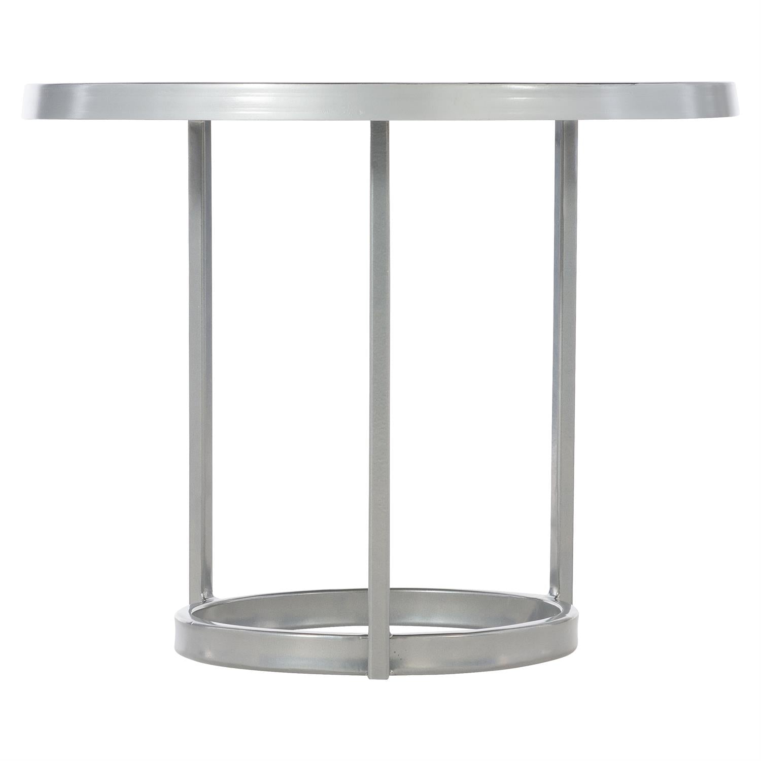 Round top of cast aluminum covered with Black baked enamel finish.Tubular iron base in Nickel finish.Three legs and stretchers.Adjustable glides.