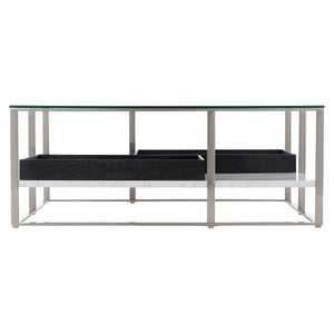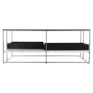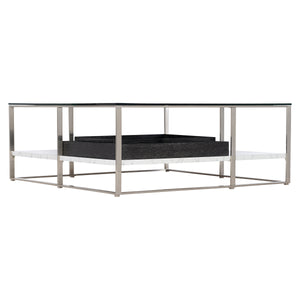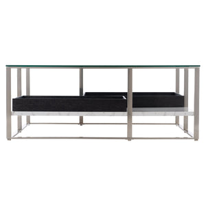 Lay-on tempered square glass top.Stainless steel frame in Silver Mist finish.Hand-painted faux marble shelf.Two removable wood trays in Cerused Mink finish.Adjustable glides.