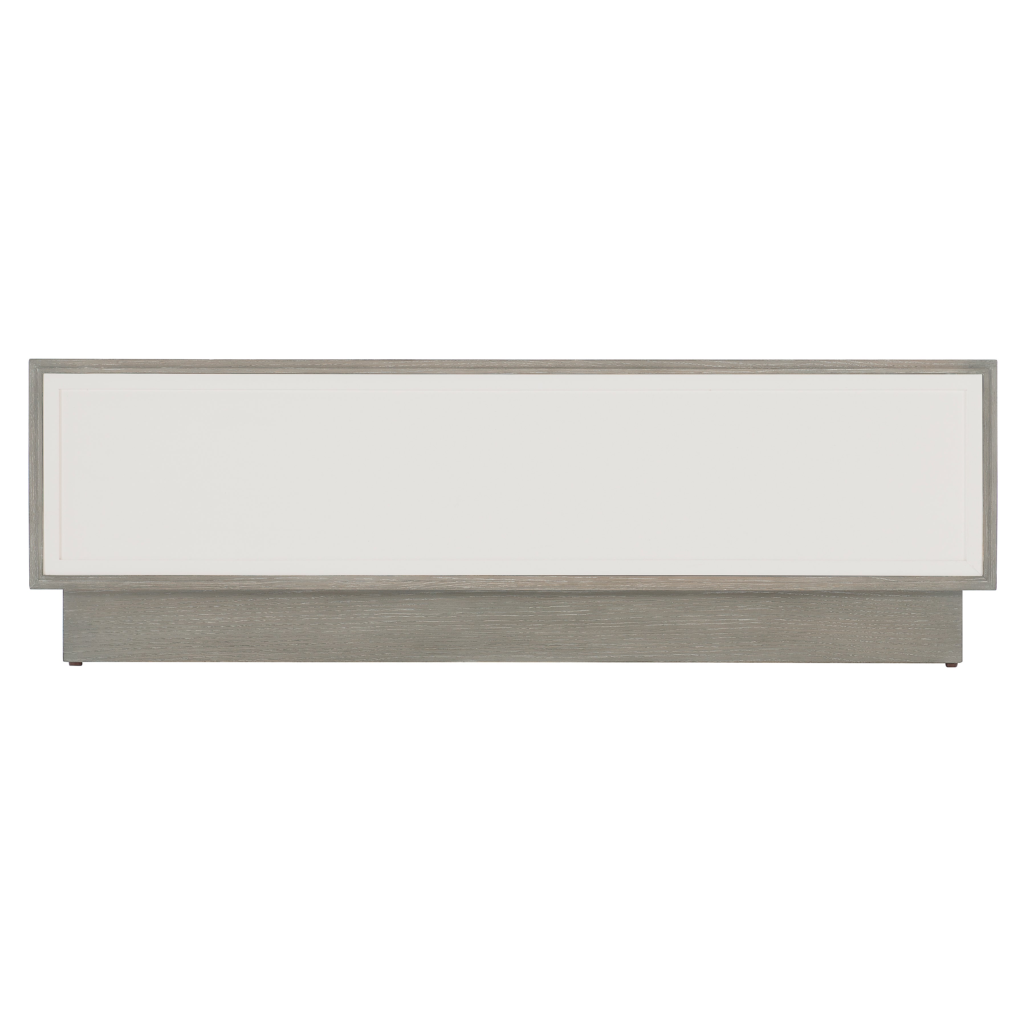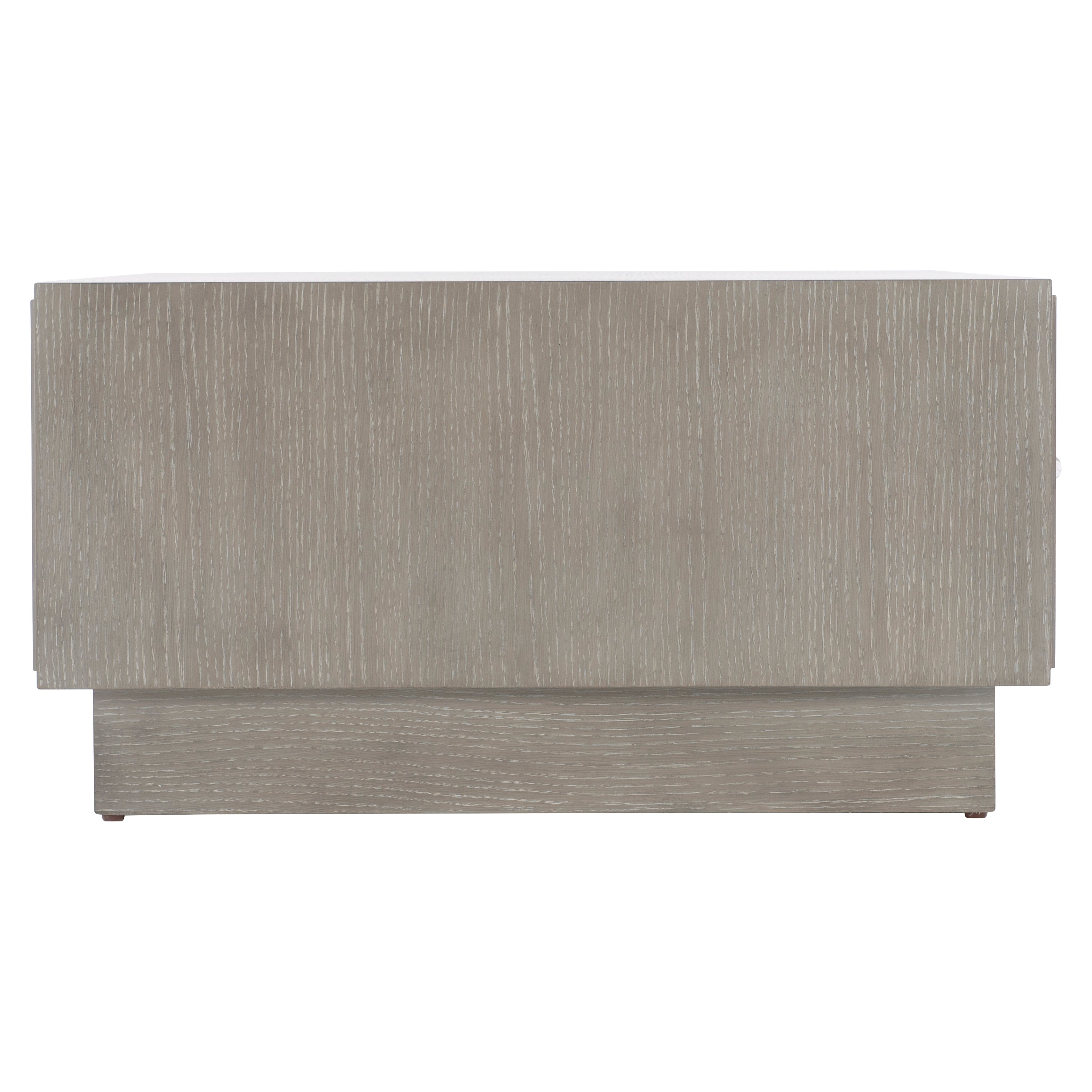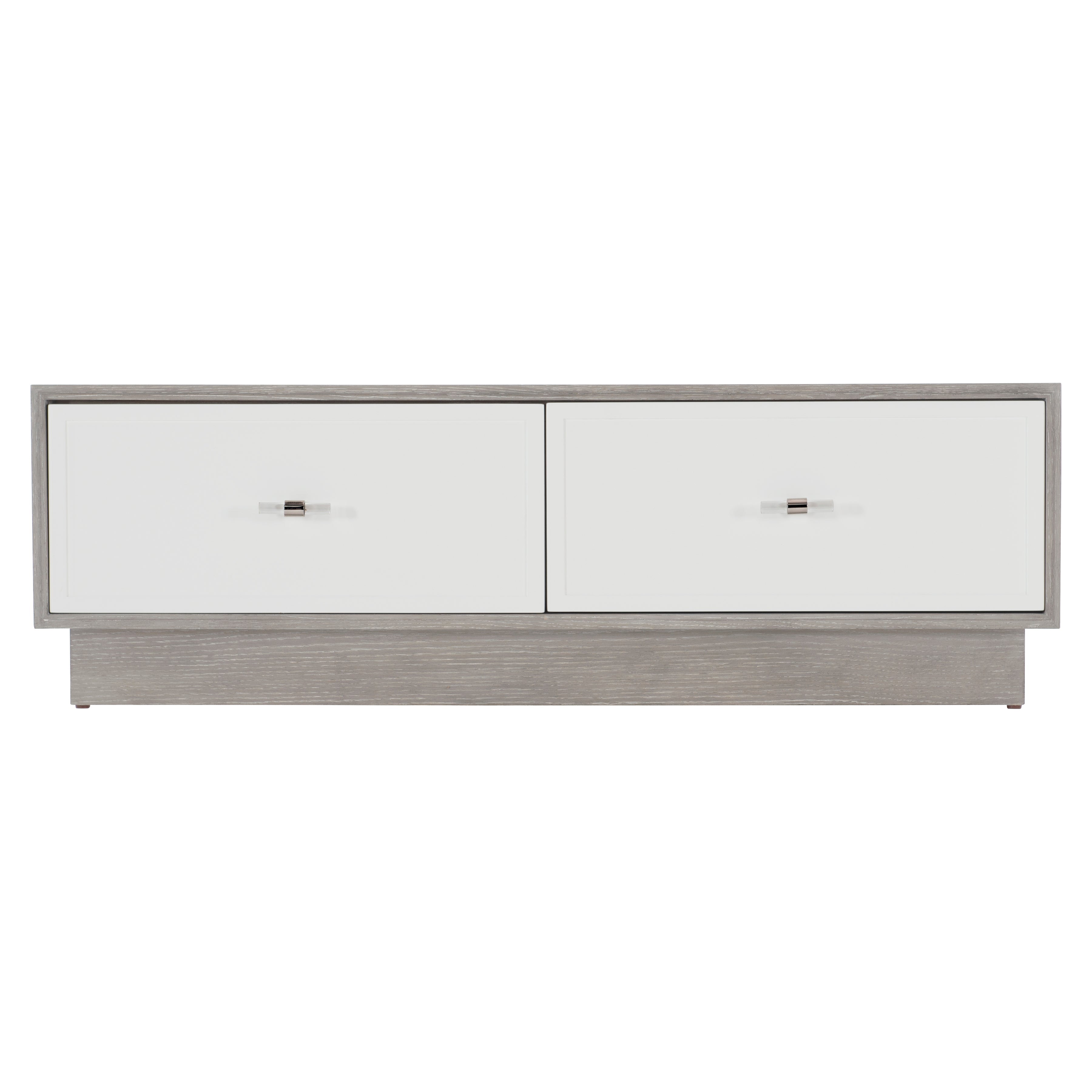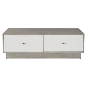 Table case in Cerused Greige finish.Two soft-close drawers with drawer fronts in Lacquered White finish.Hardware of lucite and Polished stainless steel.Casters.