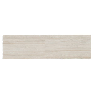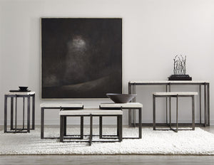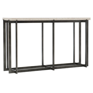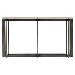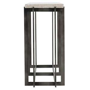 Rectangular console table.Laminated White Travertine stone top.Tubular steel base in oil-rubbed Bronze finish.Adjustable glides.