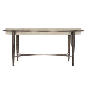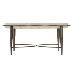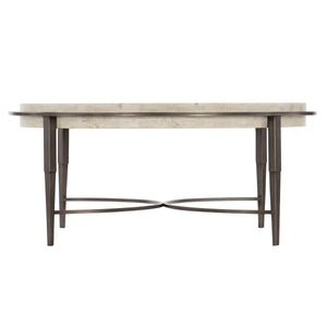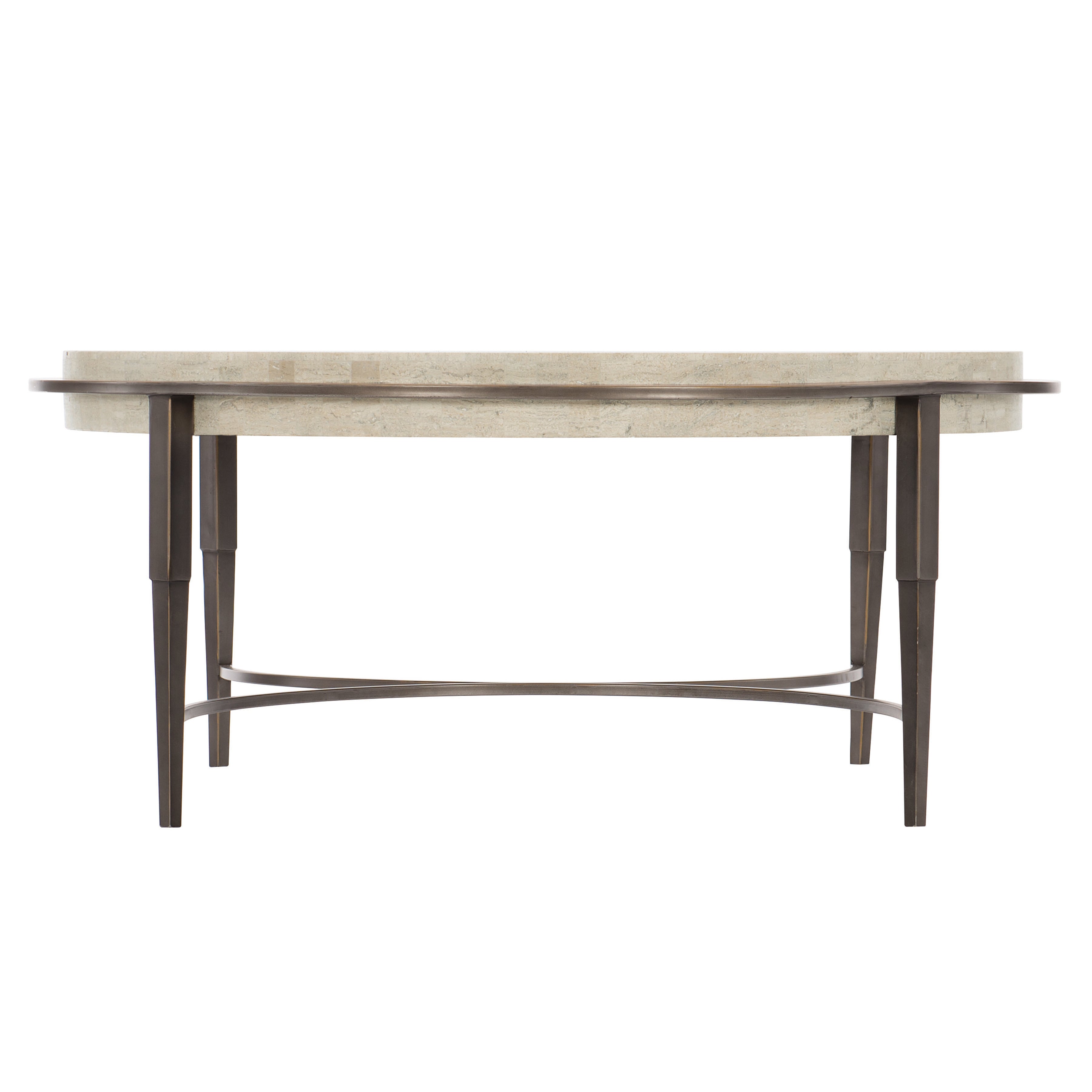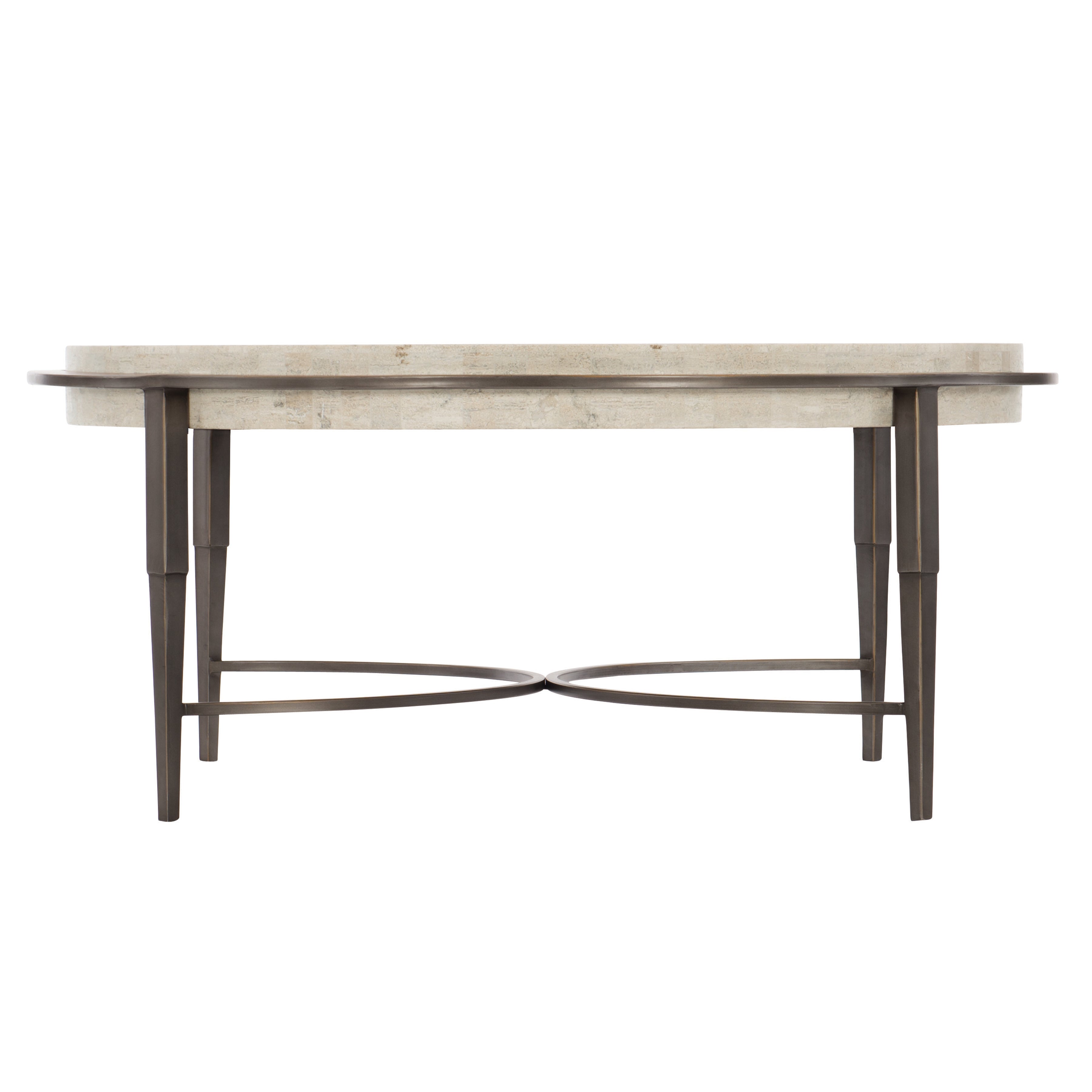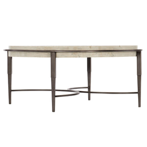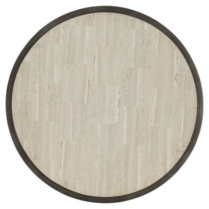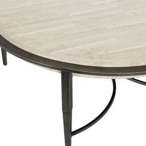 Round cocktail table.Inset honed White Travertine unsealed stone top.Plated steel base and stretchers in Antique Pewter finish.Adjustable glides.