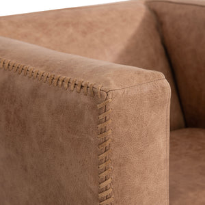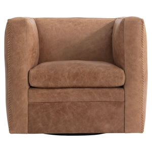 Cube-shaped club chairDecorative leather top-stitchingLuxe leather seat cushionSwivel base