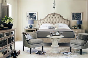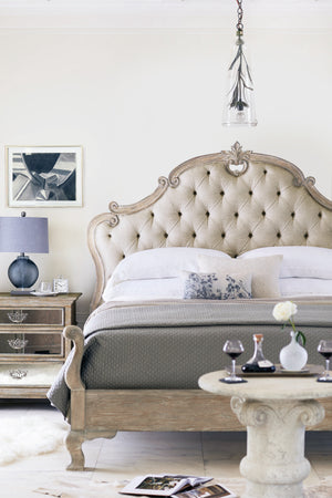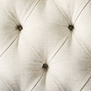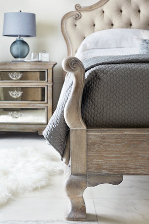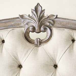 Flat Cut White Oak veneers.Wood-framed headboard with decorative carving and upholstered, button-tufted panel with welt.Wood side rails and footboard with carved posts.Three slat support system with adjustable center supports.Note: Headboard cannot be used alone. Must be ordered with footboard/side rails.