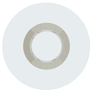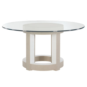 Four leg posts with connecting circular top and base.Linear Gray finish on interior and exterior face, including top surface of circular top.Linear White finish on underside of top, both sides of leg posts and top surface of circular base.Adjustable glides.Clear glass dining table top with polished edge.