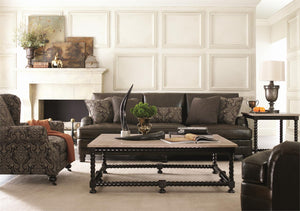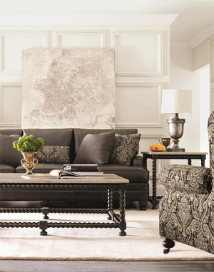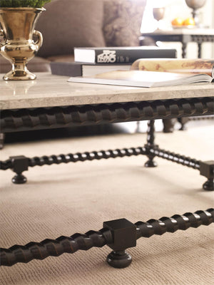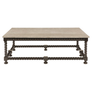 Rectangular cocktail table.Laminated Travertine stone top.Wood base in Ebonized finish.Stretchers