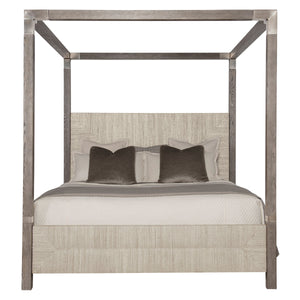Wood-framed headboard and footboard of oak solids and Rustic Flat Cut White Oak veneers in Rustic Gray finish.Woven Abaca headboard and footboard panel in Light Gray Wash finish.Wood canopy and side rails in Rustic Gray finish.Tubular steel collars and brackets in Tarnished Nickel finish.Three slat support system with adjustable center supports.