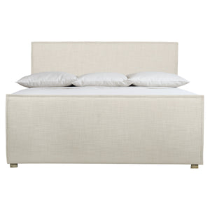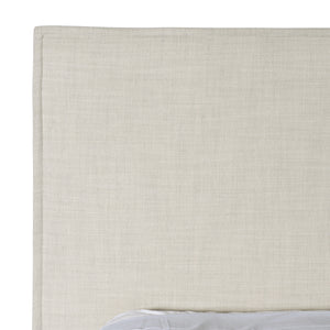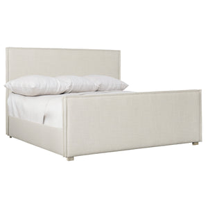 Upholstered headboard, footboard and side rails over muslin.Stiched flanged edge.Wood feet in Morel finishFive wood slat support system with adjustable center supports